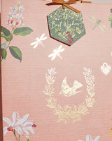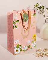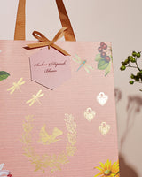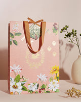 Indulge in the sheer opulence of this meticulously designed gift bag. Crafted to perfection, it's tailor-made for presenting small to medium-sized treasures. Its resplendent gold foiled embellishments exude luxury, while the handles are adorned with a fine herringbone pattern ribbon, adding an exquisite touch. Choose to personalize the tags with your names for a truly bespoke experience.