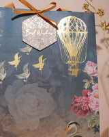 Indulge in the sheer opulence of this meticulously designed gift bag. Crafted to perfection, it's tailor-made for presenting small to medium-sized treasures. Its resplendent gold foiled embellishments exude luxury, while the handles are adorned with a fine herringbone pattern ribbon, adding an exquisite touch. Choose to personalize the tags with your names for a truly bespoke experience.