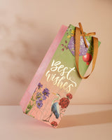 Elevate your gift-giving with the ideal bottle bag for wine, standard whiskey, or liquor bottles. The exquisite design features gold foiled elements, creating a truly captivating experience. The handles are adorned with a fine herringbone pattern ribbon, adding an extra touch of sophistication.