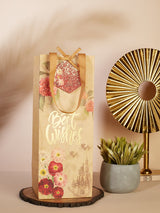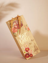 Elevate your gift-giving with the ideal bottle bag for wine, standard whiskey, or liquor bottles. The exquisite design features gold foiled elements, creating a truly captivating experience. The handles are adorned with a fine herringbone pattern ribbon, adding an extra touch of sophistication.