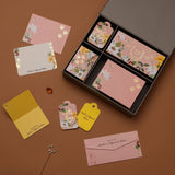 Money Envelope 7.25”x3.5” |Notecards 5.5”x4” |Gift Tags 4"x2.5" | Fold Cards 4"x5.5" when opened, 4”x2.75” when folded | Gift Box 10.75”x9.25”x2.25” inches